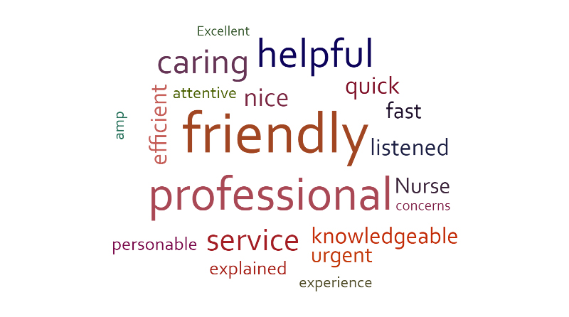 - Friendly, Helpful, and Professional were the dominant words used by patients who rated their experience as positive.